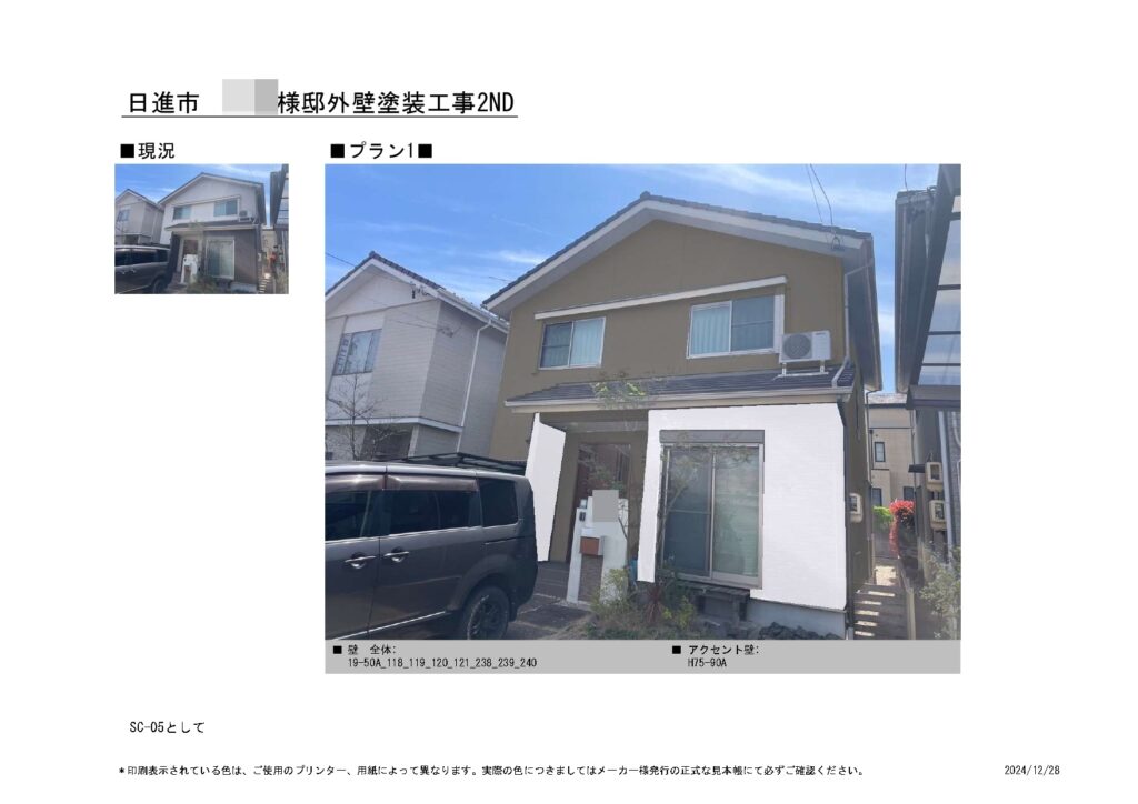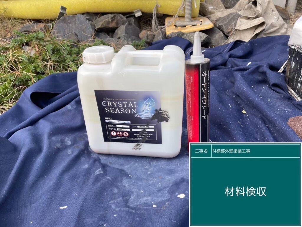 ご提案内容としましては、お客様より美観性、耐候性に優れた塗料のご提案を希望されておりましたので、高耐久性と美観性の優れた無機エクスカリバーでご提案させて頂きました。こちらの塗料は公表されている無機含有率の高さで、高耐久性は勿論の事、美観性も維持してくれる塗料となります。また美観性を底上げしてくれる仕上げ材として、弊社の取り扱っているクリスタルシーズンという光触媒コーティングのご提案もさせて頂きました。こちらは塗料仕上げ剤として最後の工程に外壁や付帯部、などお家全体に吹付けるコーティング材となります。