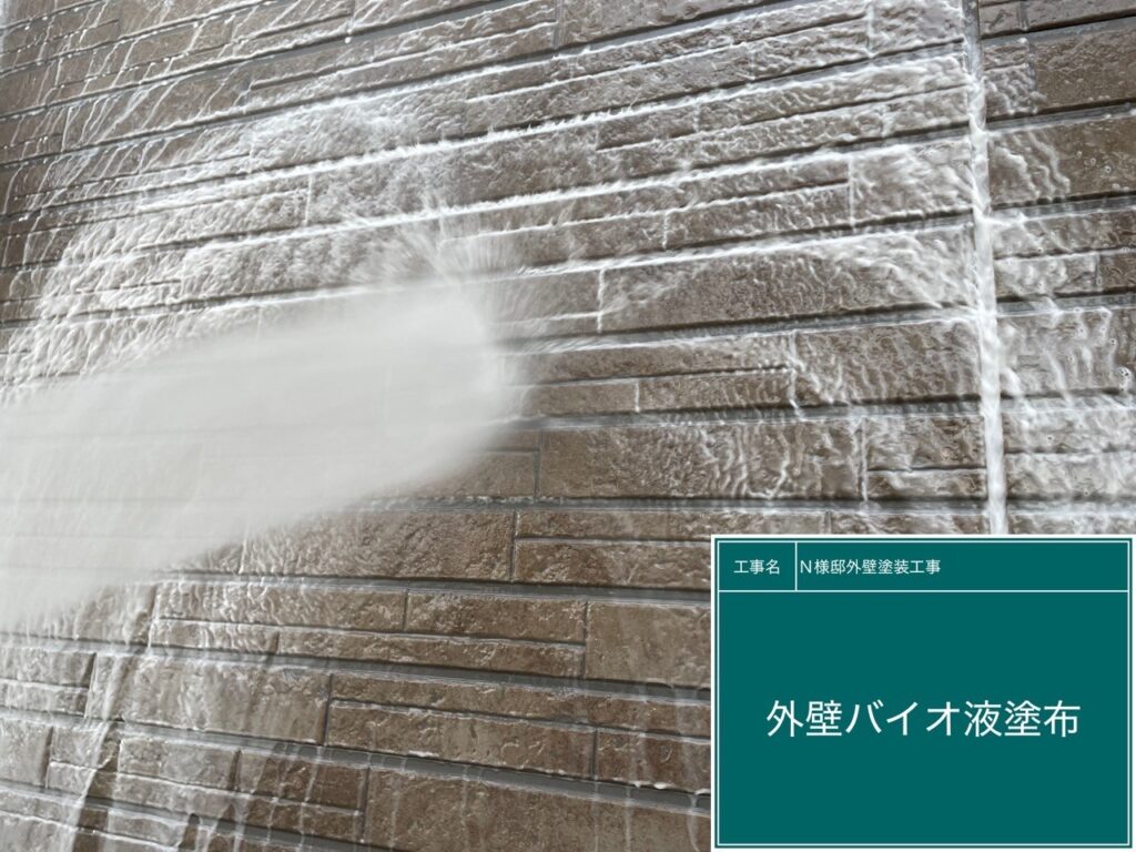 外壁に仕上げ材の光触媒プロテクトコーティング(クリスタルシーズンtg)を塗布します。