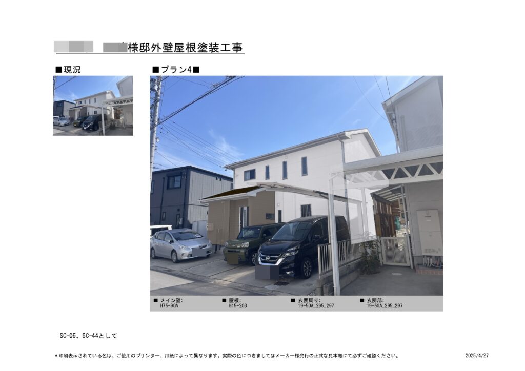 | 使用商材・建材 | 外壁 : 無機エクスカリバーAZ-W(2液型水性/バーテックス無機塗料/CPJ・~クリスタルペイントジャパン~) 外壁: ネオフレッシュティアラVM(1液型水性/無機塗料/山本窯業化工) 屋根 : 無機エクスカリバーMZ-R(2液型弱溶剤/バーテックス無機塗料/CPJ・~クリスタルペイントジャパン~) 目地&開口部 : SRシールH100(超耐久・高耐候シーリング材/サンライズ) 付帯 : 4Fイージスガード(2液型弱溶剤/無機配合型4フッ化フッ素塗料/CPJ) 仕上げ : クリスタルシーズンtg(可視光応答型ハイブリッド光触媒プロテクトコーティング) |