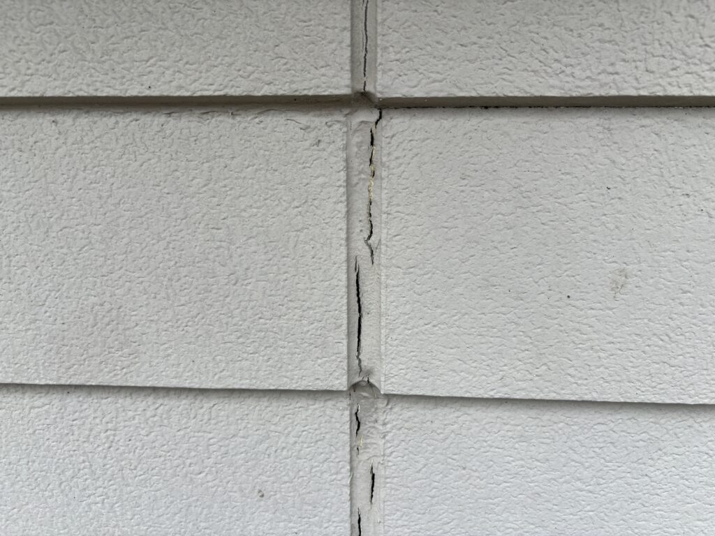 表層塗膜は劣化しています。反りかえりやクラックが起こる前に塗装しましょう(冬場、基材自体に水分を含み凍結するとヒビ割れが起きます)。縁切り作業(タスペーサー設置)し、3回塗り致します。