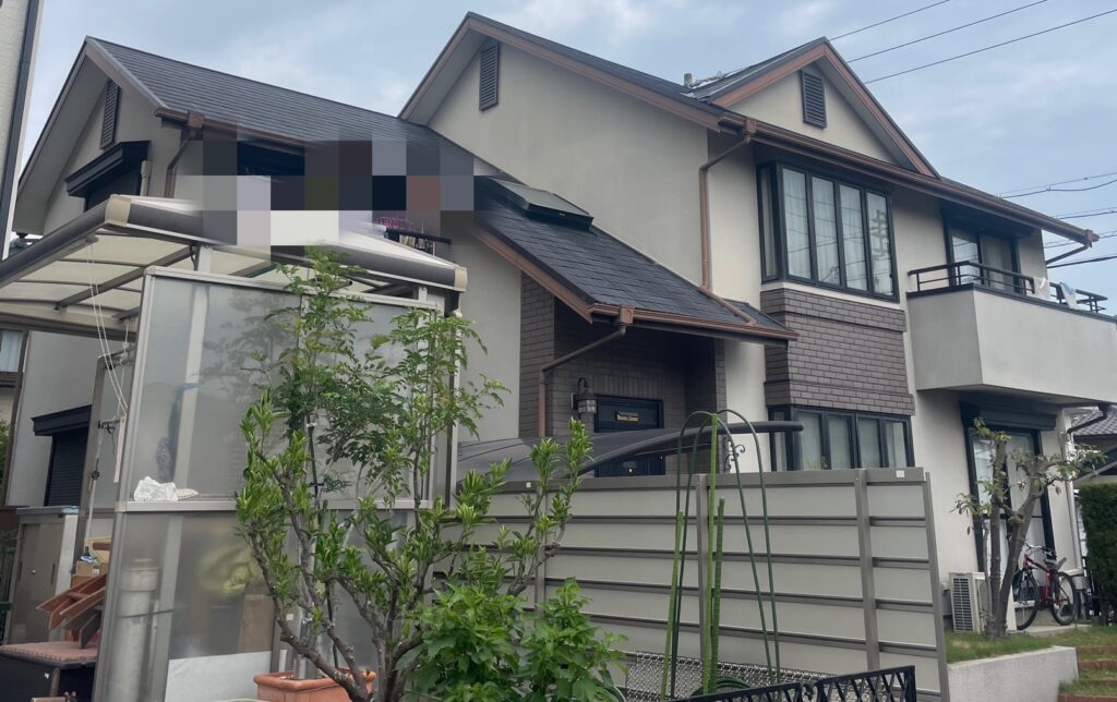 M様のお宅は、築25年、三井ホームさんのお家の2回目の外壁屋根塗装工事となります。外壁に関しましては経年劣化に伴うチョーキング現象、コーキングの劣化が目立ちメンテナンスの必要がありました。モルタルの外壁です。洗浄(下地調整)後、下塗りを施し主材塗料にて中塗り・上塗りを行います。特にバルコニー壁や西面の壁は日当たりが良く、膨張収縮が起こり続けております。屋根部分は薄型スレート瓦(無石綿スレート/カラーベスト等)です。板金部にサビ止めを塗布後、屋根塗料にて塗装致します。バルコニー防水に関しましては、FRP防水が施されています。捲れや浮き箇所はない状態だと思います。防水層を保護するトップコート工法をご提案致します。