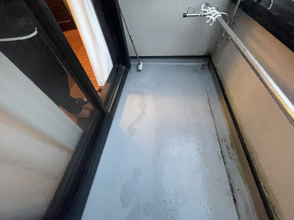 ベランダ床に仕上げ材の光触媒プロテクトコーティング(クリスタルシーズンtg)を塗布します。