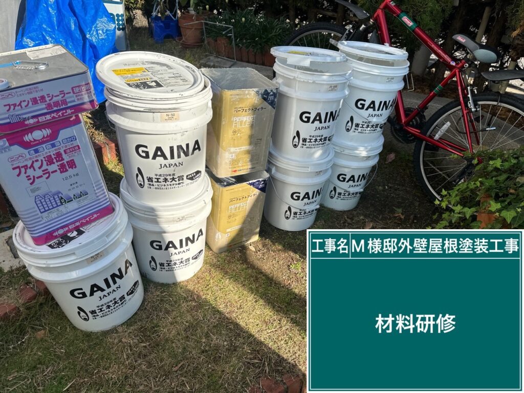 | 使用商材・建材 | 外壁 : 断熱無機ガイナ(特殊セラミック塗料/日進産業) 屋根: 断熱無機ガイナ(特殊セラミック塗料/日進産業) 付帯 : 4Fイージスガード(2液型弱溶剤/無機配合型4フッ化フッ素塗料/CPJ) 目地&開口部 : SRシールH100(超耐久・高耐候シーリング材/サンライズ) 仕上げ材:光触媒プロテクトコーティング/クリスタルシーズン® |