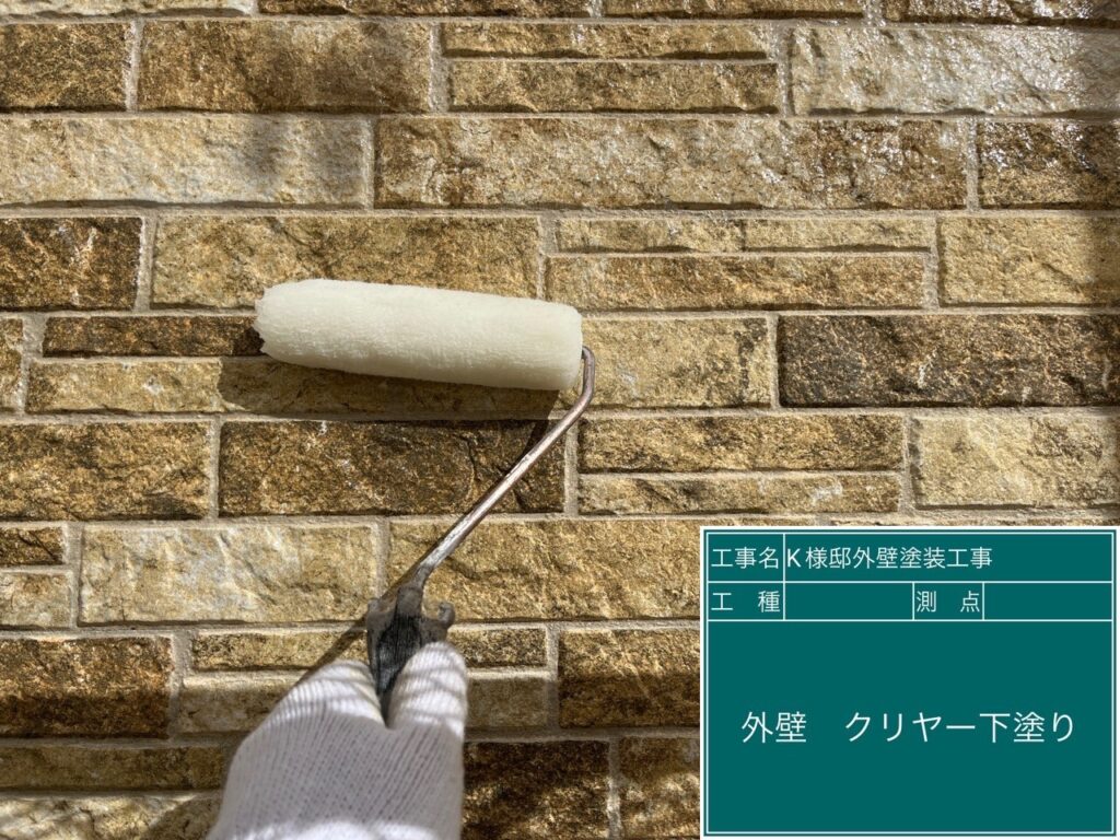 壁に仕上げ材の光触媒プロテクトコーティング(クリスタルシーズンtg)を塗布します。