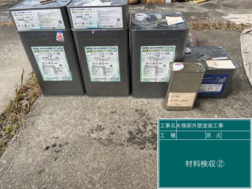 | 使用商材・建材 | 外壁 : 無機エクスカリバーAZ-W(2液型水性/バーテックス無機塗料/CPJ・~クリスタルペイントジャパン~) 目地&開口部 : オートンイクシード(超高耐久・高耐候シーリング材/オート化学工業) 付帯 : 4Fイージスガード(2液型弱溶剤/無機配合型4フッ化フッ素塗料/CPJ) 仕上げ : クリスタルシーズンtg(可視光応答型ハイブリッド光触媒プロテクトコーティング) |